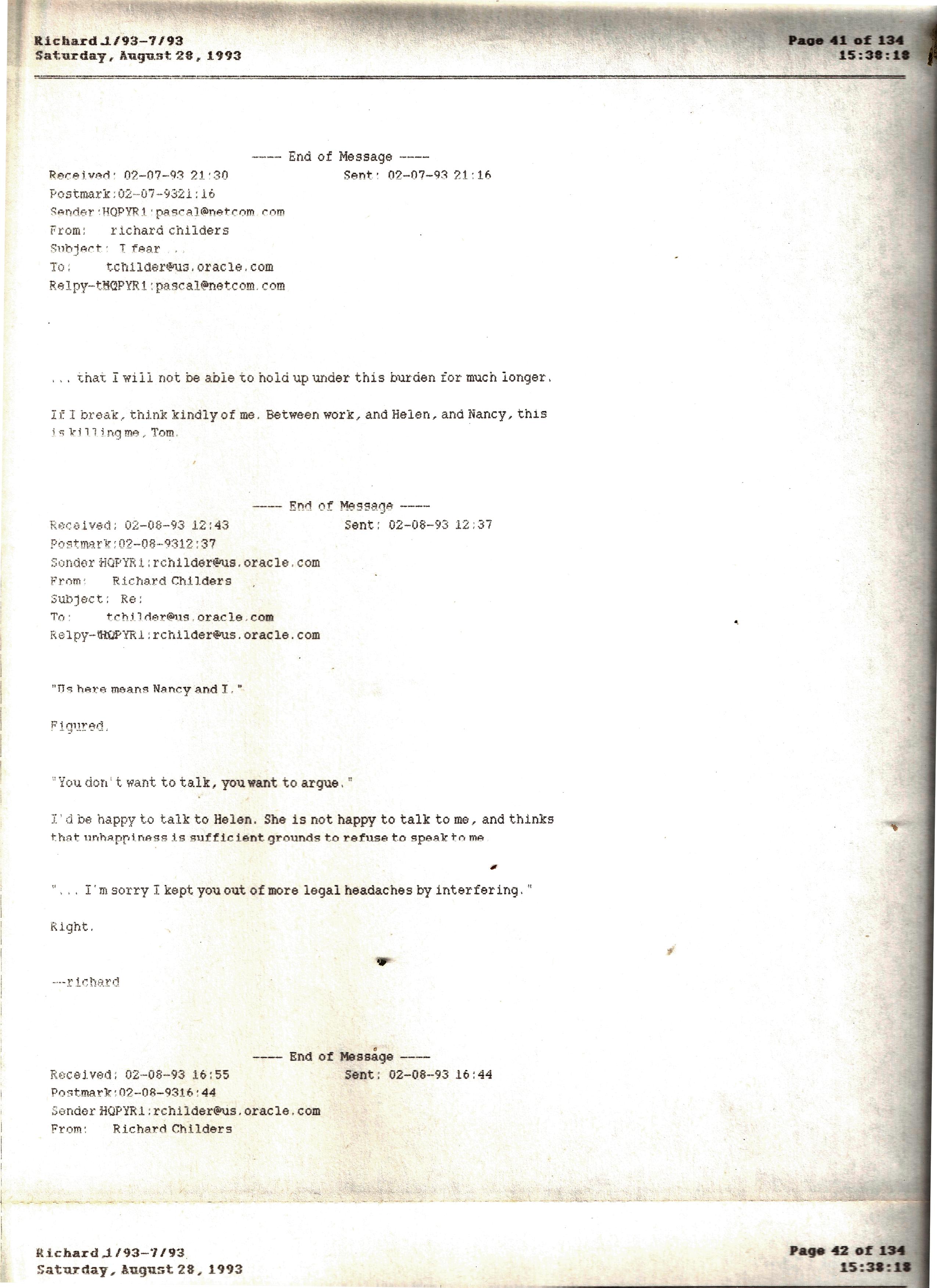 Tom appears to have spent the better part of an entire day - Saturday, August 28, 1993 - printing out emails related to his younger brother: