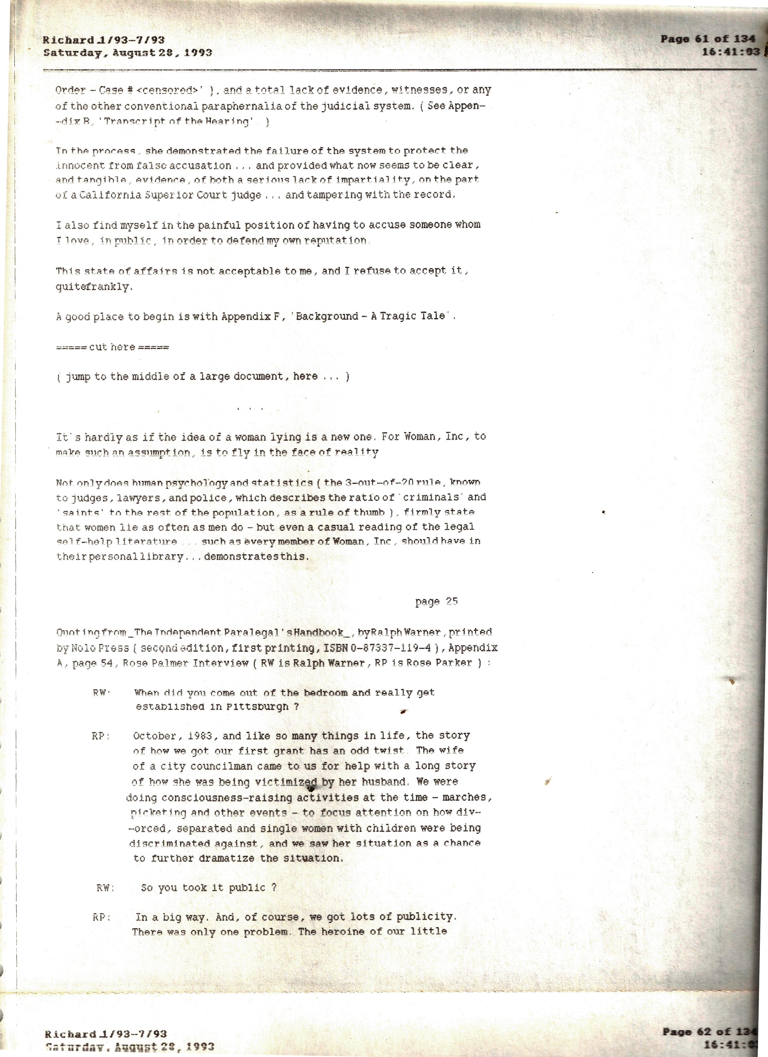 It can be said that the entire 134-page-long printout is all new evidence. Particularly those portions where I am discussing the events relating to my pending termination, at Oracle, with my fellow Unitarians, in our ostensibly private BITNET-based mailing list, UUS-L.